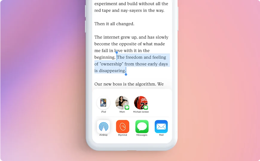 With the mymind browser extension or mobile app installed, you can save quotes, feedback, notes or any other text to your mind without losing focus.